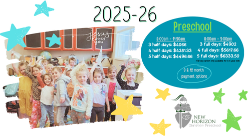 Thank you for your interest in New Horizon Christian Preschool. Please take a moment to familiarize yourself with our school by looking over our handbook below. If you have any questions, please feel free to contact our school office at 541-884-6467.